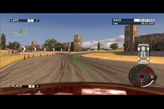 右側と左側は全く同じ場所にいるシーンです。単に視点だけ変えています。左の画面ではタイヤがコース脇にのりあげてしまっているか視覚的に判りますが、右の画面では判断がつきにくいですよね。実は、この場面では、コントローラーの振動機能が働き、体感的に乗り上げてしまっていることが判るようになっています。ちなみに、ここで無理な操作をすると、車種によってはあっというまにスピンしてしまったりするので、こういった視覚以外のからの情報が得られるのは良いですね。