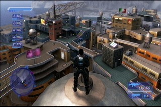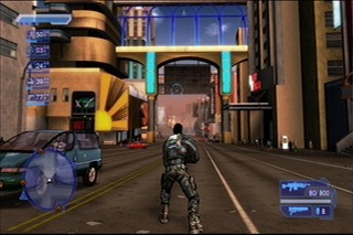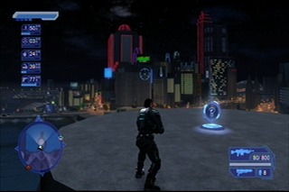ライオットアクトの特徴の一つとして「自由度」があげられるでしょう。自由度といってもいろいろな意味がありますが、その一つとして「MAPを自由に行き来できる」というものがあります。ライオットアクトのステージは実際の街よろしく、低層の建物から高層ビル、公園から豪邸までといろいろな施設を伴った立体的な町並みが構成されていますが、実際に遊んでみると「回りきれないほどの広さ」という印象はうけません。これは主人公の移動能力の高さが裏目に出てしまっている部分だろうとおもいますね。なんといっても改造人間ですので、まず走る速度が常人並ではありません。実際に自分のキャラクタを動かしてみると、ビデオは早送り再生を見ているようなキビキビとしたモーションにて、かなりのスピードで走ることが可能です。そしてジャンプ能力も高く、ビルからビルもひとっ飛びという感じですし、移動手段として最初からクルマが利用できる為、ある程度遠くへ移動する際にも、クルマでサット移動することが可能となっています。その為、結果的に「MAPが広くても、それ以上に移動能力が高いので、相対的に狭く感じる」という印象になってしまうかと思われます。個人的には「MAPの広さが売り」なのではなくて「街を隅々まで自由に移動できる自由度」のほうが売りとしては正しいのかな?という印象を受けています。なお、画面左下には周辺MAPが表示されますが、これがまた帯に短し襷に長し状態で、微妙に使い勝手が悪い感じを受けますね。もう少し広範囲に対応するか、クルマ移動時には道路マップが別に出るなどの工夫が欲しかったところです。